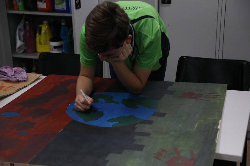 Our students worked in pairs, pouring their creativity into a 1m x 1m wood panel. Their artwork showcases abstract painting techniques, collage, and stencilling, representing a researched issue close to their hearts.