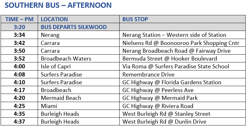 Any messages to students regarding stop changes are to be received before boarding the bus. Alternatively, you are welcome to call the school office on 5655 0300 any time up until 2:45pm to advise of a change to your student's bus journey for that afternoon and a message will be passed directly to your student in the last session.