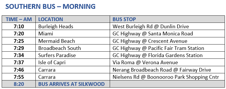 Silkwood School offers a daily bus service for students travelling to and from our Mount Nathan Campus. We operate a fleet of modern, air-conditioned buses equipped with three-point seat belts.